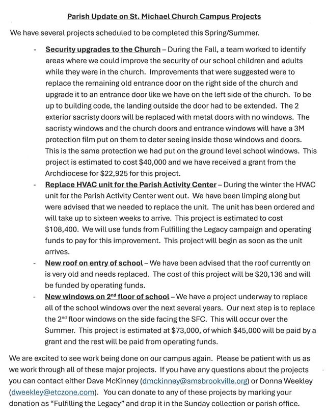 St. Michael Live Stream update. Our parish volunteers are having difficulty with the Sunday Live Stream. Facebook seems to be the culprit. Therefore, we will no longer live stream through the Facebook page. We will continue to use our YouTube channel for live streaming. If we have trouble with LIVE feed on YouTube the Mass will be recorded and uploaded later that same day. The button above will take you straight to the YouTube page so you can subscribe.